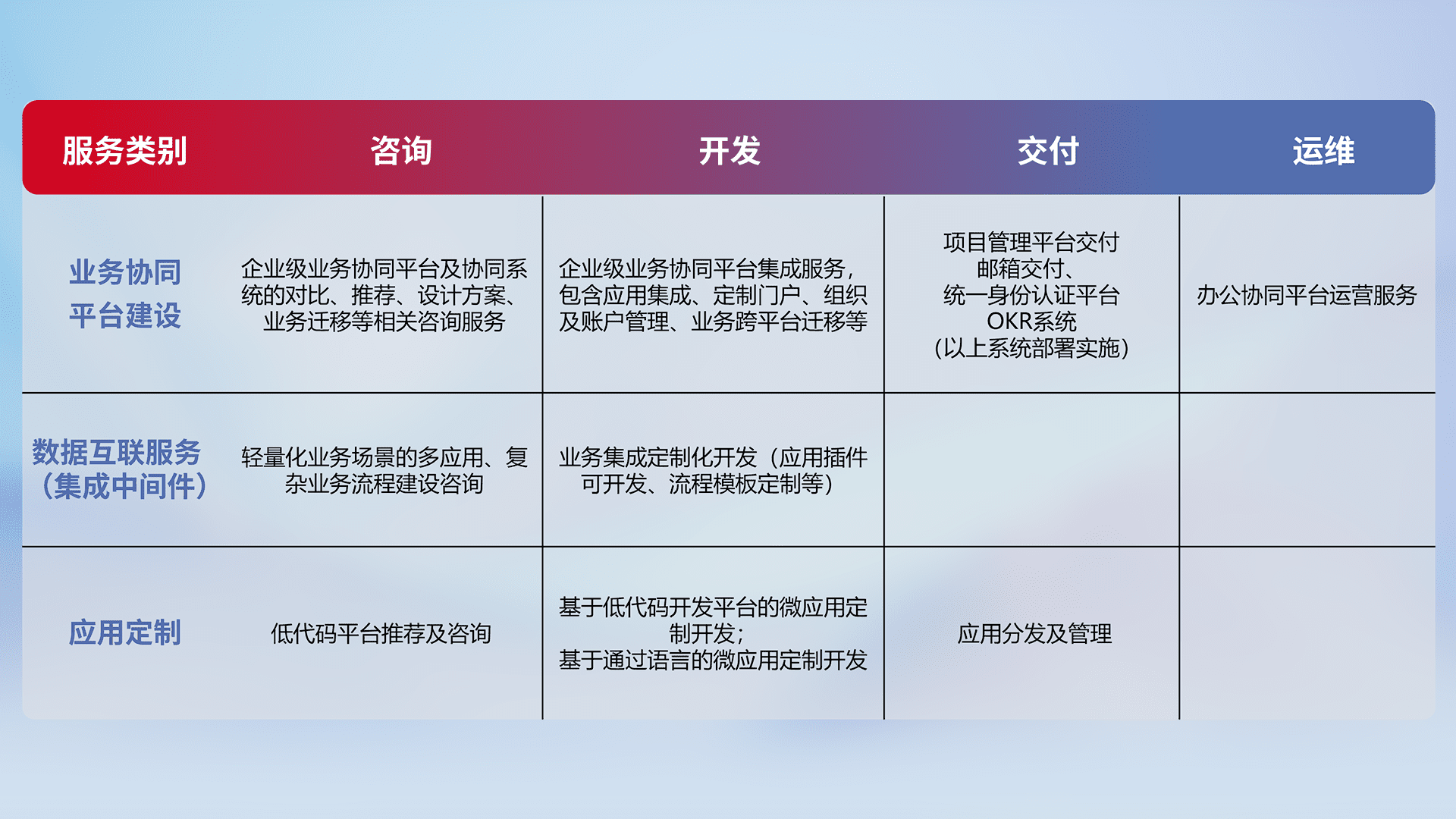 针对钉钉、、企微、、、IDaas等平台级产品提供产品的规划、、、、方案、、交付、、、、定制化开发等服务,,,,实现如统一协同办公、、、智能客户服务、、混合会议管理、、、智能数据查询、、、、等业务场景,,,,实现数字化转型。。。