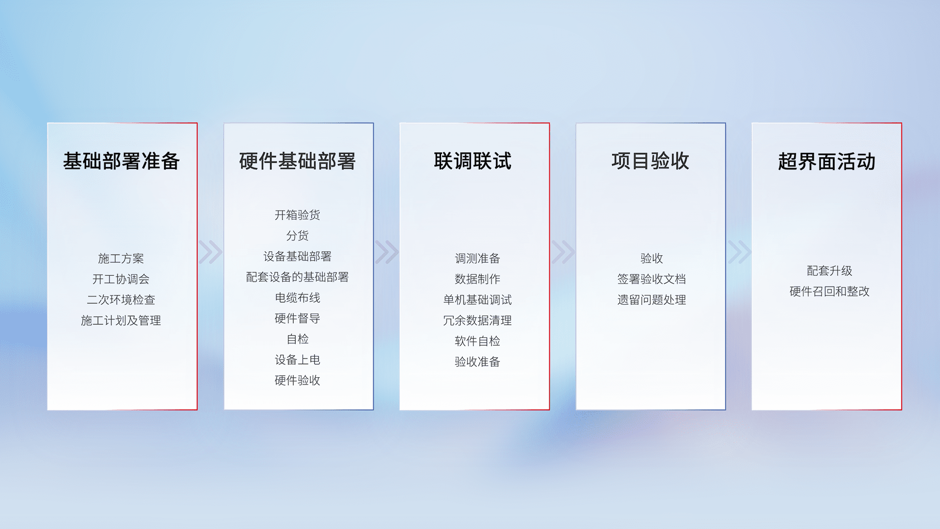 从基础部署准备、、、硬件基础部署、、、、联调联试、、项目验收、、、、越界面活动的全过程可追溯,,,保证施工质量和进度。。